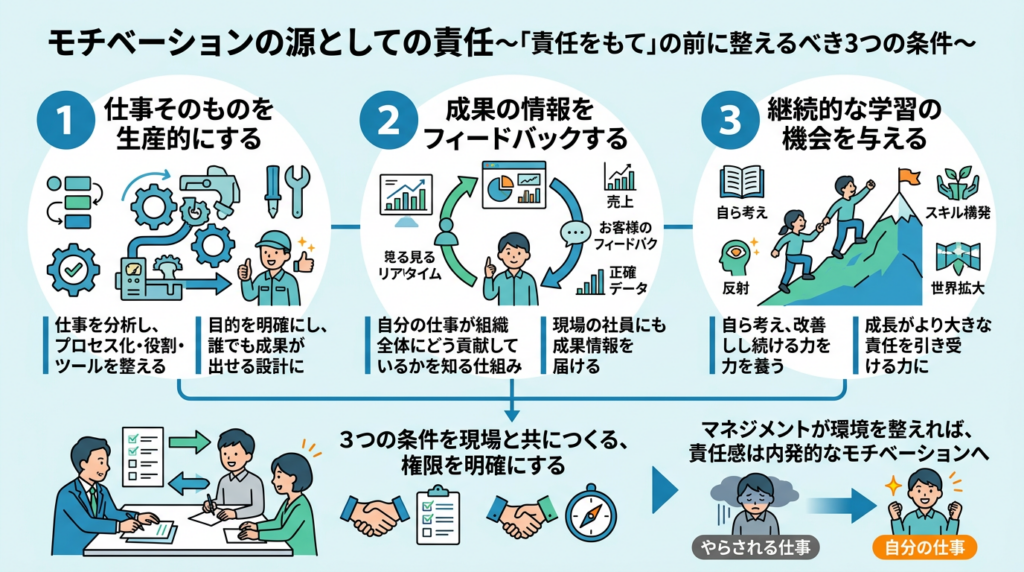 責任感を高めようと呼びかける前に、責任をもてる環境が整っているかを確認すること。それが、経営者やマネジャーとして最初に取り組むべきことです。3つの条件を一つひとつ丁寧に整えることで、社員は「やらされている仕事」から「自分の仕事」へと意識を変えていきます。そのとき、モチベーションは外から与えるものではなく、内側から湧き出るものになるのです。